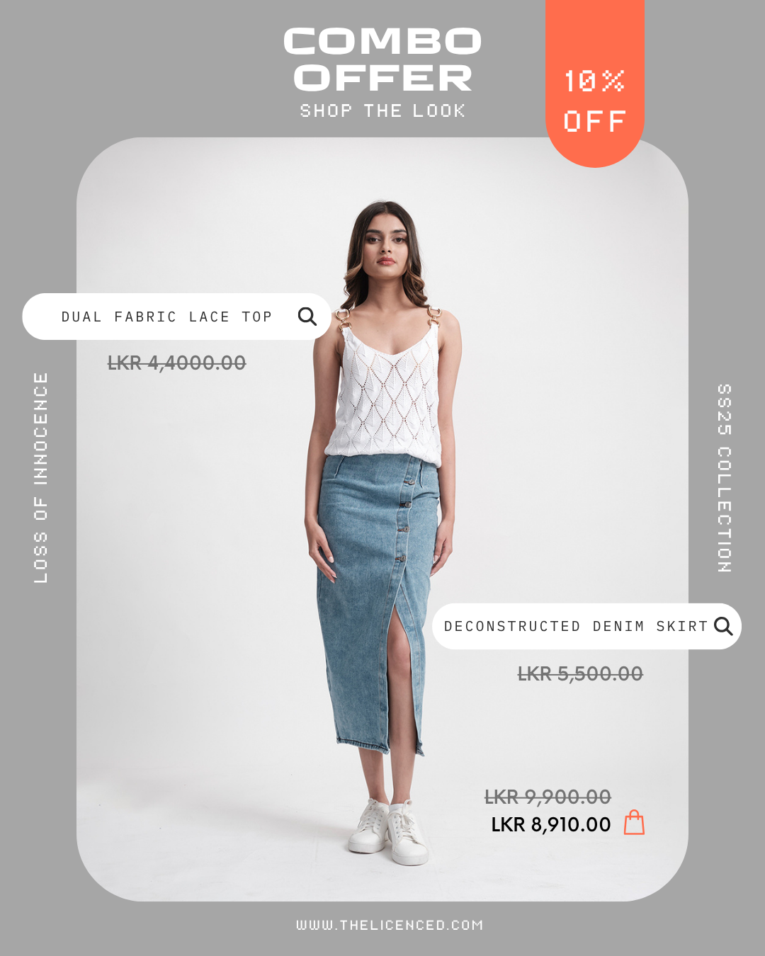 Soft tones and structured fits come together in the Coastal Muse Combo. Featuring the airy Dual Fabric Lace Top in ivory and the high-slit Deconstructed Denim Skirt, this combo brings feminine energy with clean summer polish.