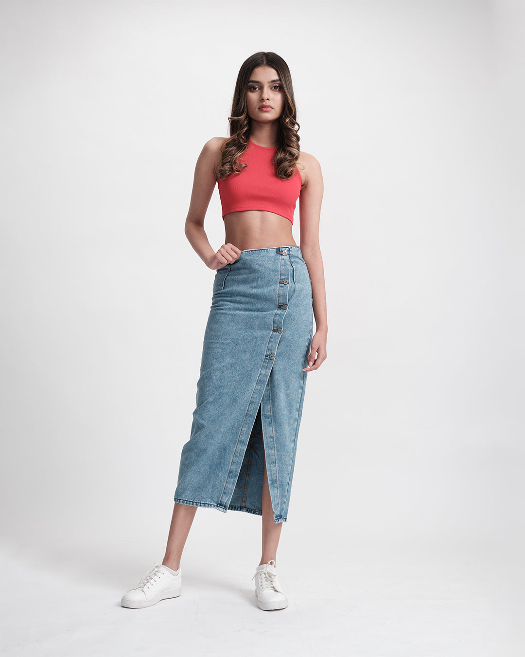 Skirt: High-waisted denim, side button detail, mid-slit for movement