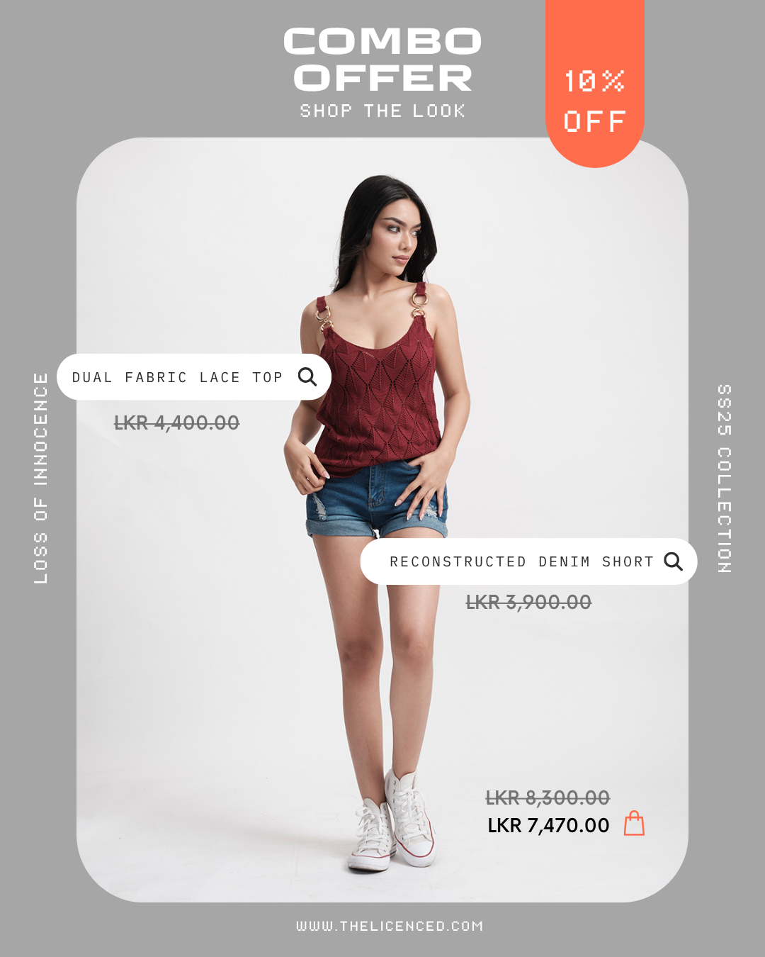 A daring mix of texture and edge, this summer-ready combo features the rich-toned Dual Fabric Lace Top with metal ring details and the bold Reconstructed Denim Short. It's the ultimate warm-weather fit for confident days out. Lightweight, breathable, and fierce.