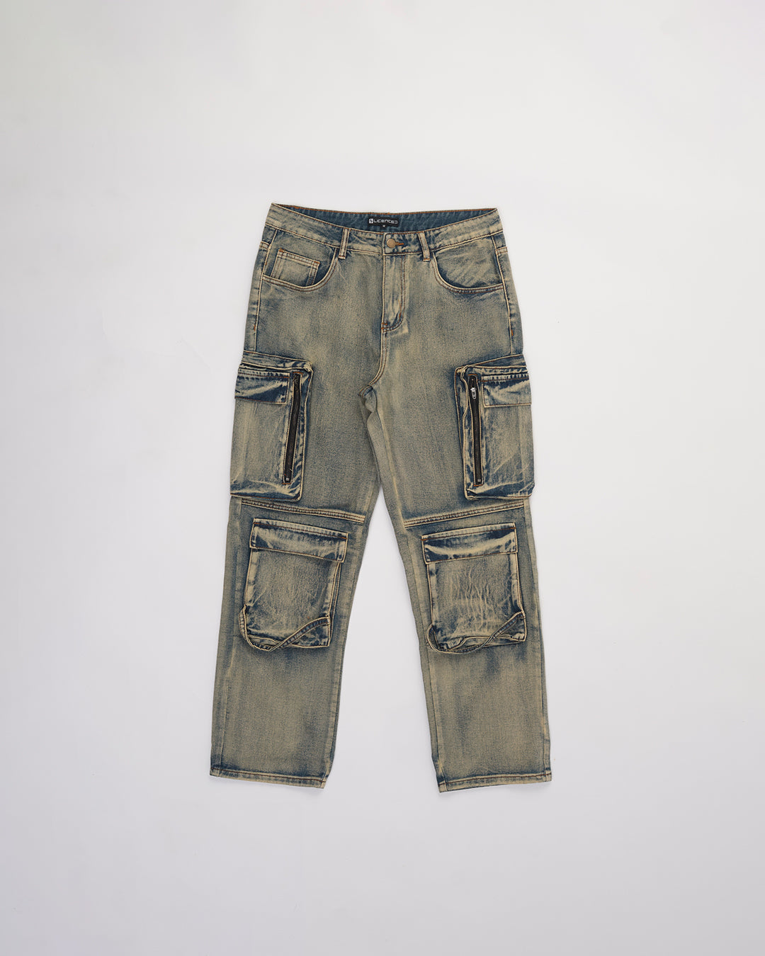 Pants: Heavywashed cargo denim, oversized pockets, street attitude