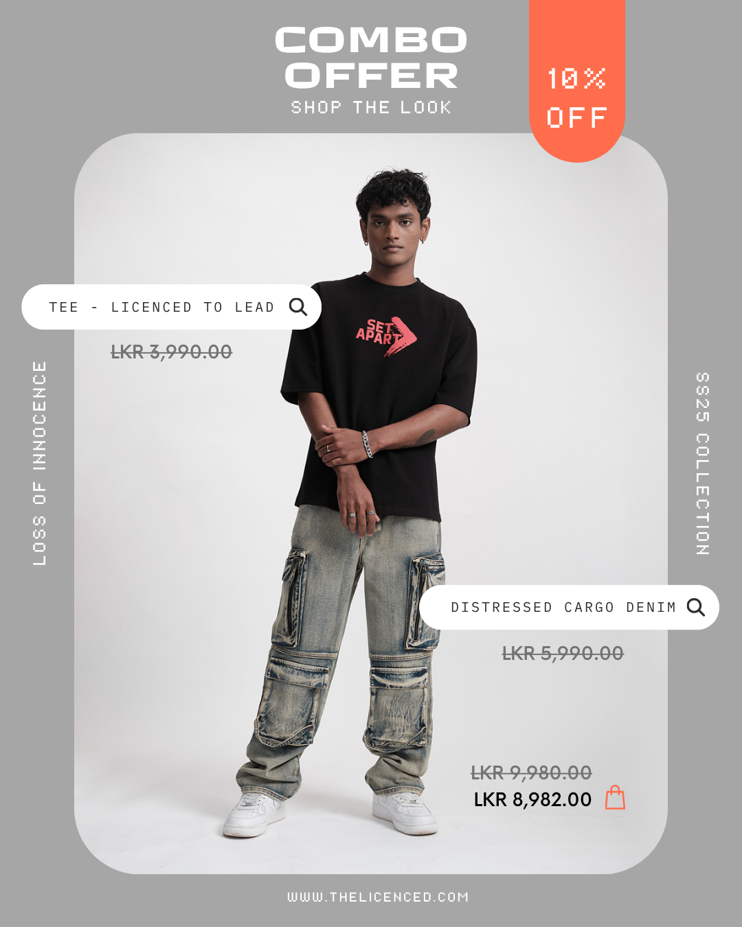 Unapologetically bold — the Urban Rebel Combo pairs the graphic Licenced to Lead tee in black with rugged Distressed Cargo Denim. This look is designed to defy norms and define new streetwear energy.