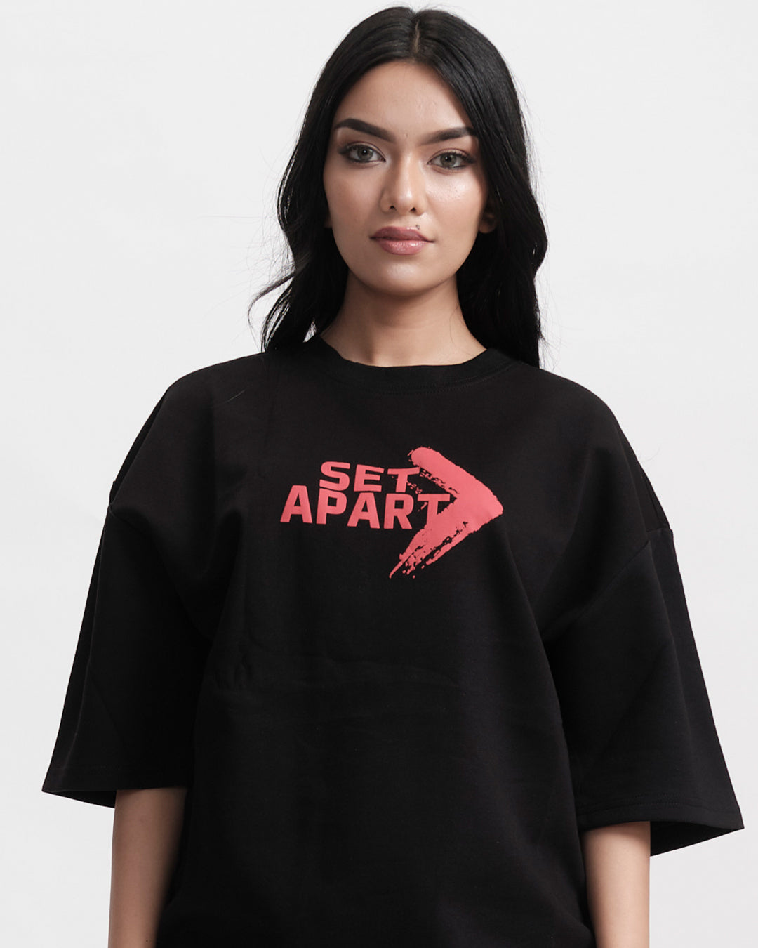 Tee: Oversized fit, "Set Apart" graphic print, jet black