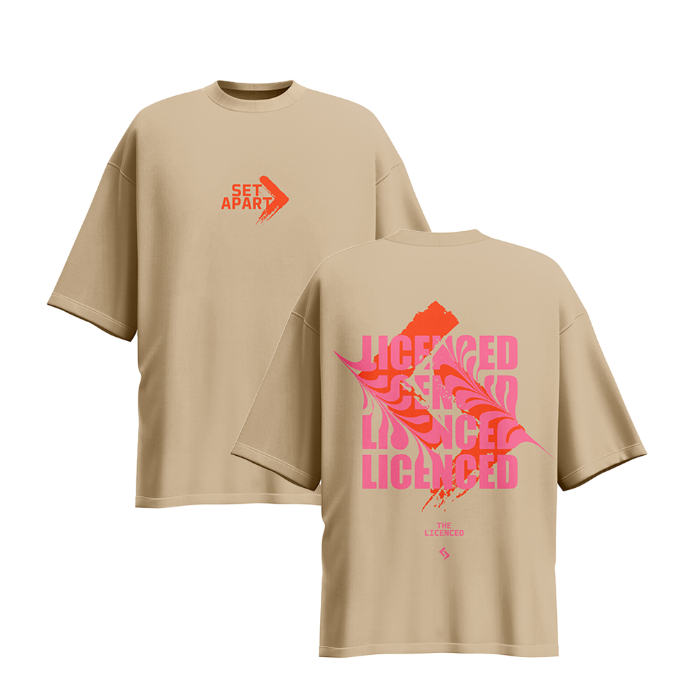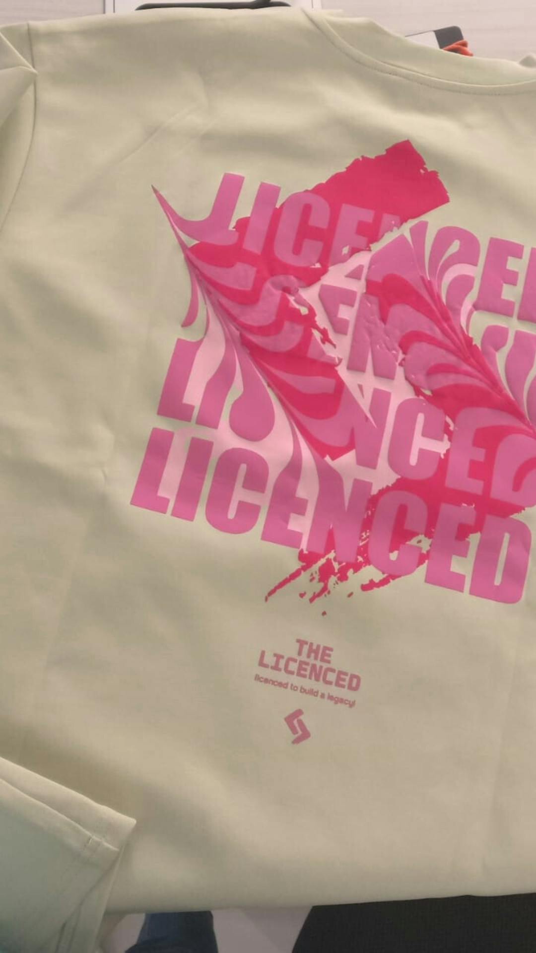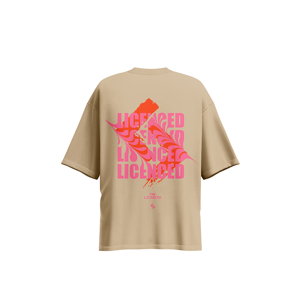 Bold strokes meet vibrant expression in this striking design! The back print combines modern typography with dynamic patterns, symbolizing the energy of breaking free and carving your unique path. The repeated 'Licenced' typography reflects persistence, while flowing abstract elements and bold orange accents signify creativity and forward momentum.