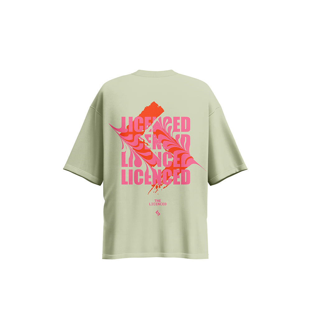 Bold strokes meet vibrant expression in this striking design! The back print combines modern typography with dynamic patterns, symbolizing the energy of breaking free and carving your unique path. The repeated 'Licenced' typography reflects persistence, while flowing abstract elements and bold orange accents signify creativity and forward momentum.