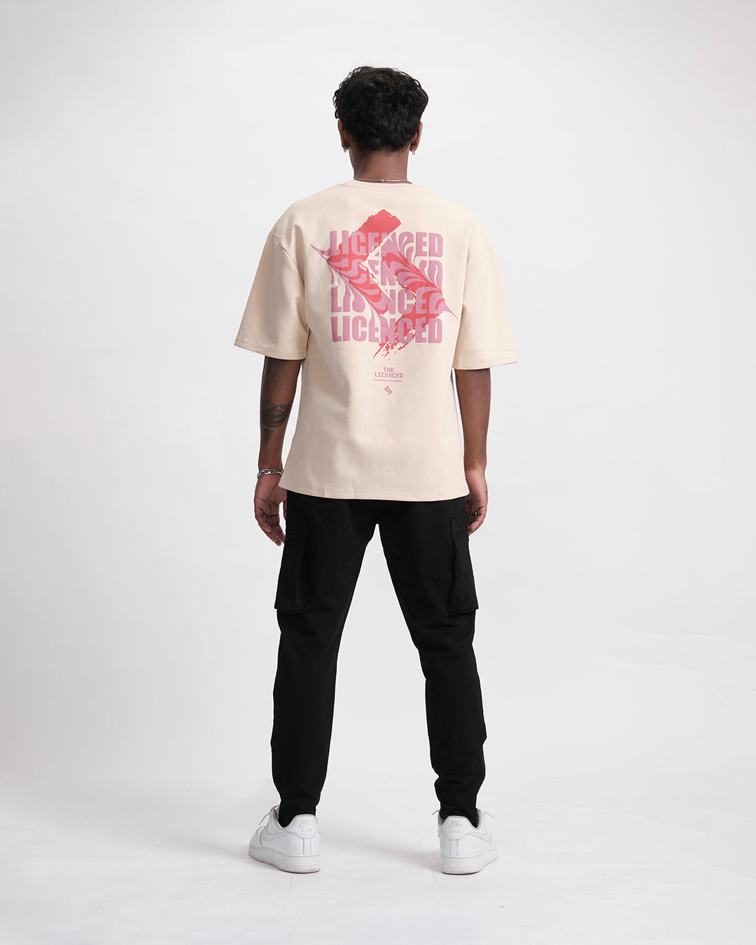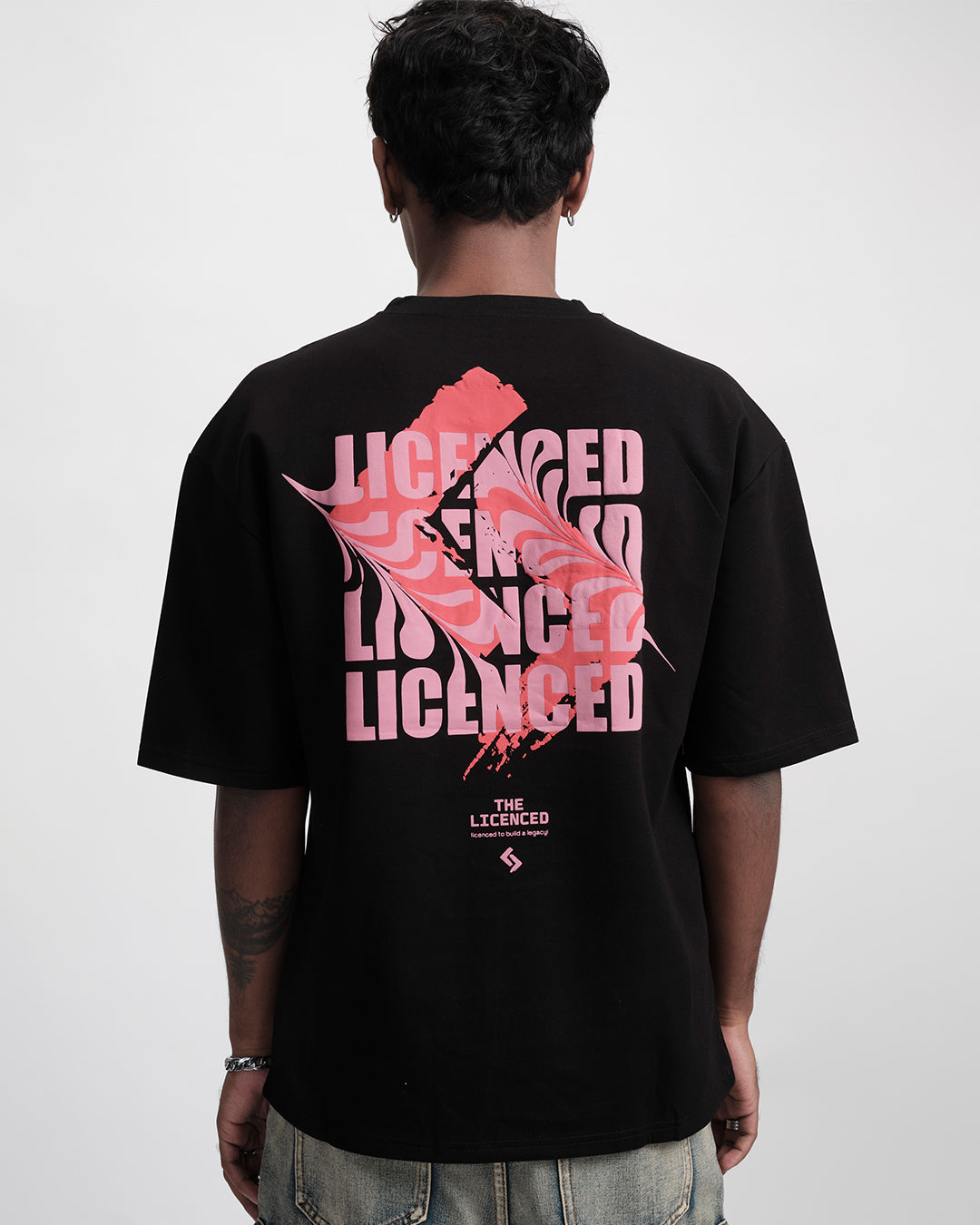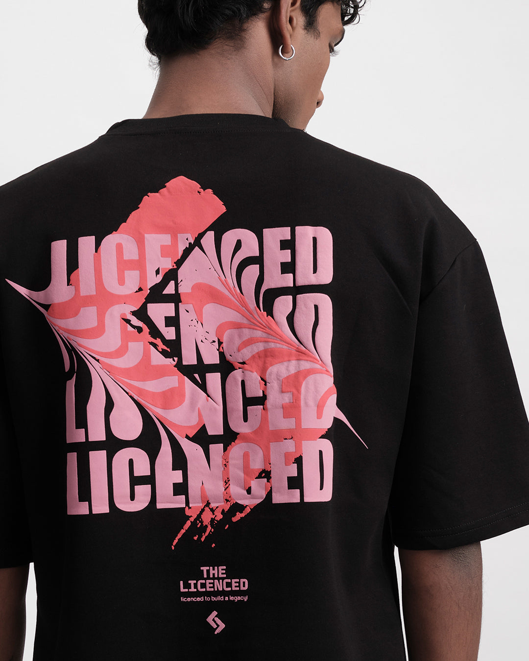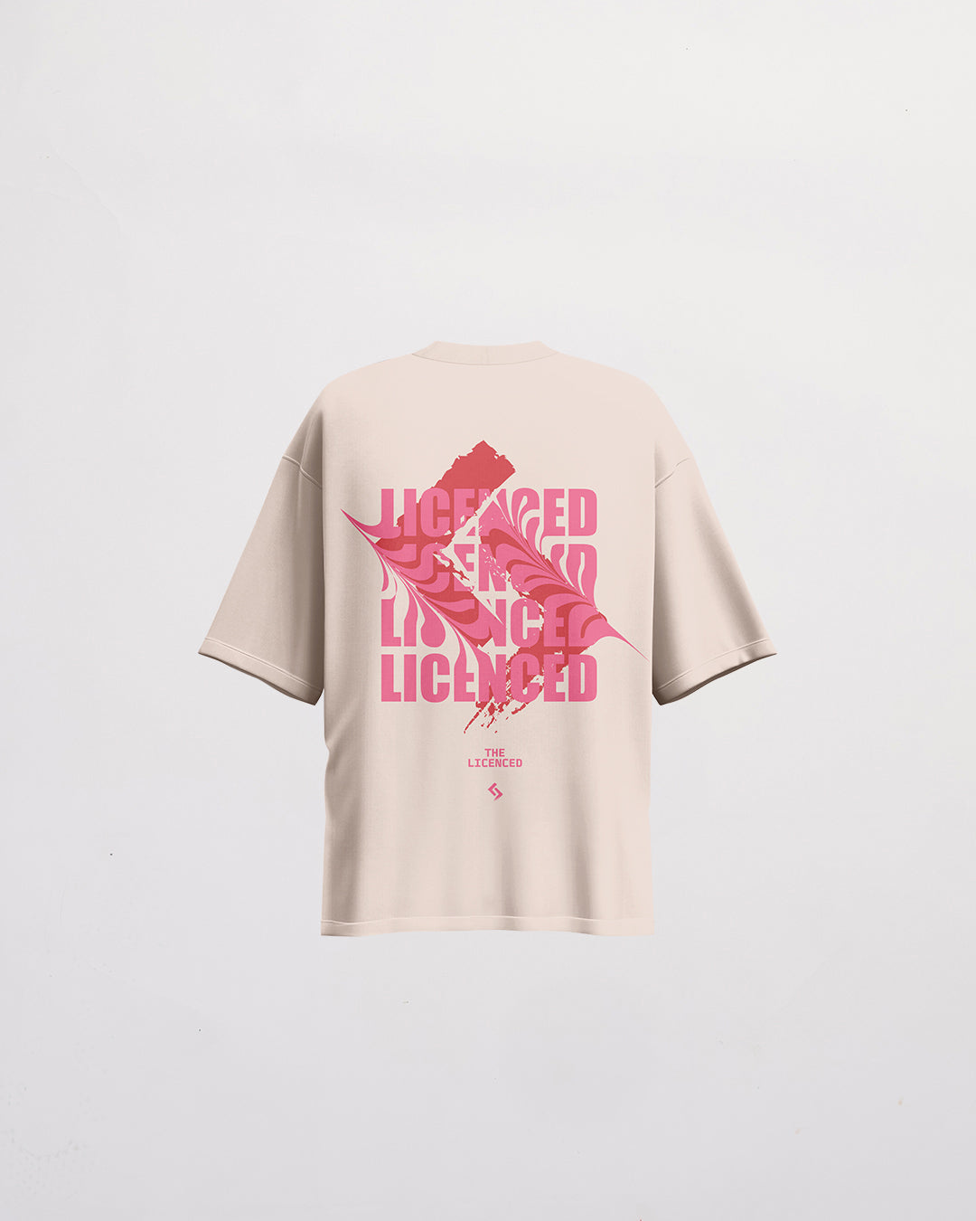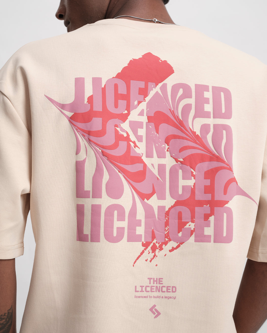 Bold strokes meet vibrant expression in this striking design! The back print combines modern typography with dynamic patterns, symbolizing the energy of breaking free and carving your unique path. The repeated 'Licenced' typography reflects persistence, while flowing abstract elements and bold orange accents signify creativity and forward momentum.