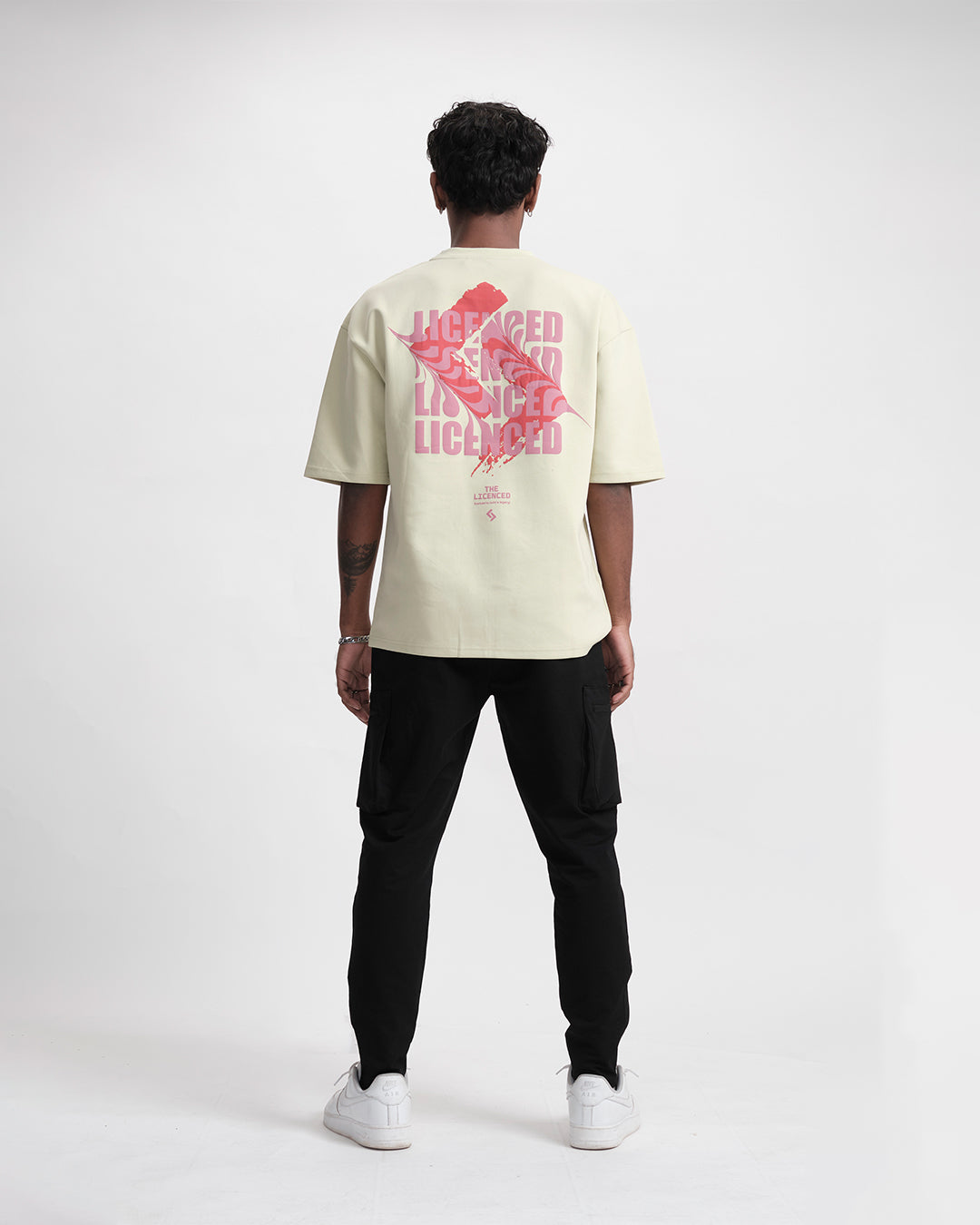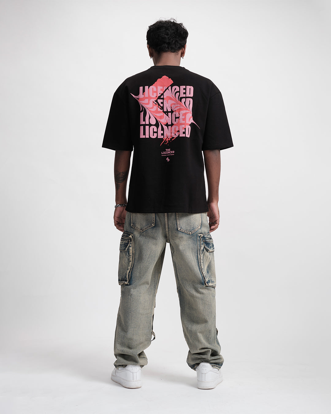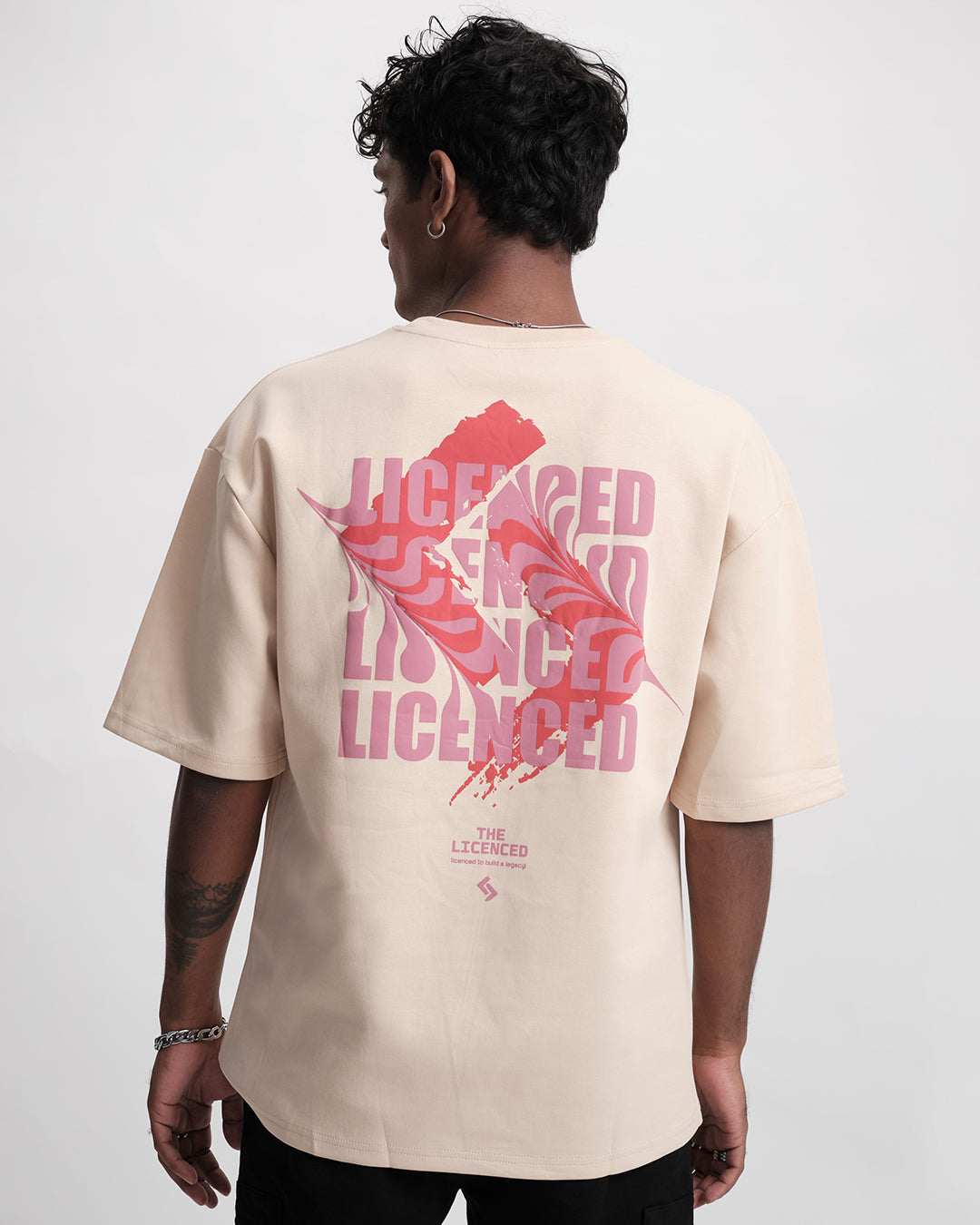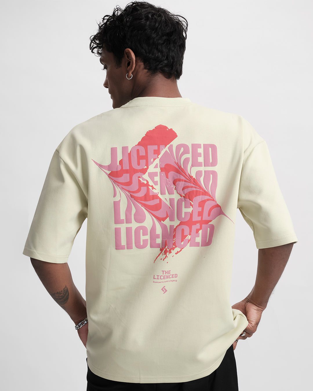 Bold strokes meet vibrant expression in this striking design! The back print combines modern typography with dynamic patterns, symbolizing the energy of breaking free and carving your unique path. The repeated 'Licenced' typography reflects persistence, while flowing abstract elements and bold orange accents signify creativity and forward momentum.